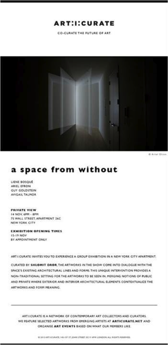 N/I: In order to be featured on art:i:curate, artists have to submit either individual artworks or an exhibition proposal. Likewise curators can propose exhibitions by contacting submission@articurate.net for further information. On www.articurate.net members can then decide which artists will be exhibited offline by liking artworks and following artists. Also through the “Curated by” section users can select a minimum of six artworks to share with the community and group them under a specific curatorial theme. Some have chosen to draw attention to contemporary artists from their hometown; other themes are more abstract and have particularly pointed out a general predilection towards photography and film as sculptural mediums. To organise events and exhibitions, the platform has teamed up with sponsors from various sectors, such as Ligne Roset, Pernod Ricard, asset management firms and private individuals.