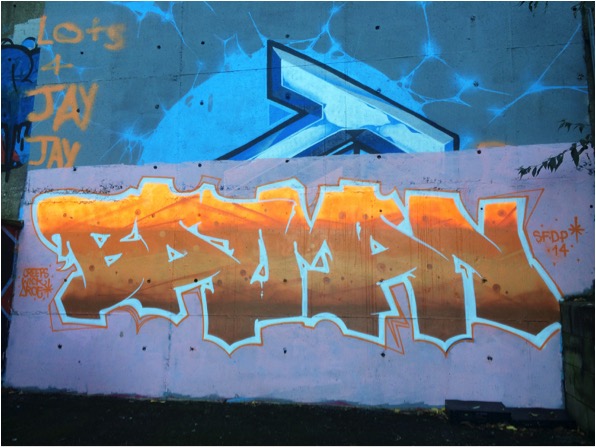 To a passerby the graffiti in this area feels like a valid addition to the bare walls and stark architecture which dwarves the area, those walls that are blank serve as a unwritten warning – council buildings or private property. Every other surface has the daub and of colour and image.