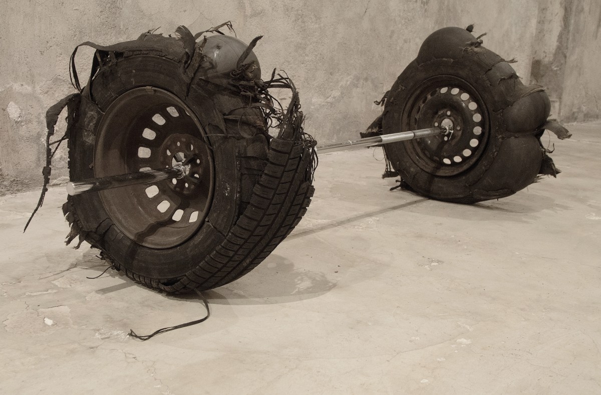 NOT YET by Ovidio project, tires, inner tube, barbell, 220x60x70 cm, view in the studio, Catania, 2014
