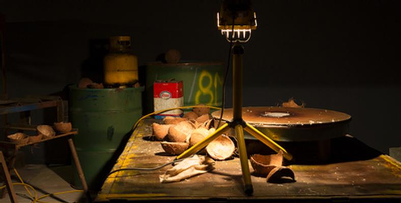 Nicholas Mangan, Progress in Action, 2013, single channel video (silent), converted diesel generator, coconut oil refinery, coconut oil. Courtesy of the artist, Chisenhale Gallery, Artspace Sidney.