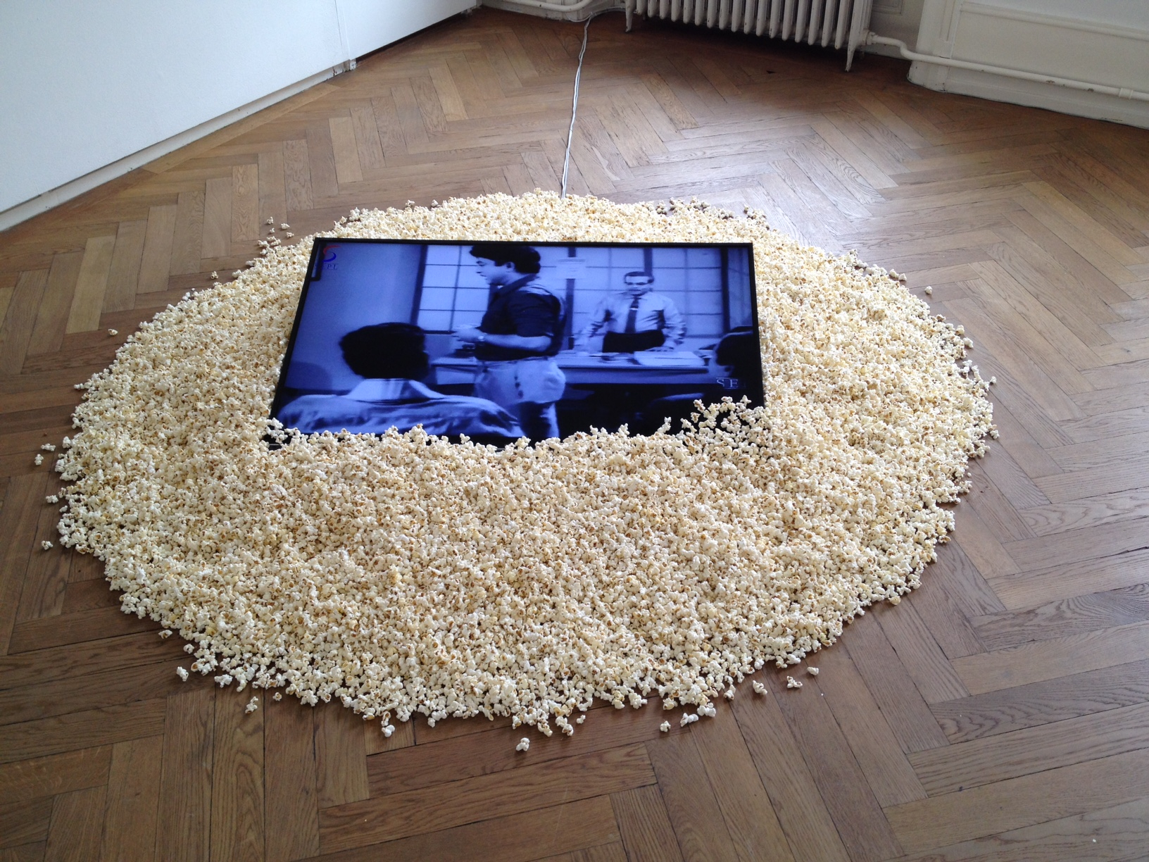 Installation of First-Viewer Television. A monitor displaying a live streaming of zero-views videos from YouTube, with a side of fresh popcorn.
