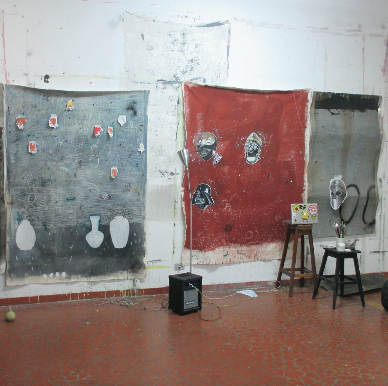 acrylic, charcoal, synthetic enamel, pen, pencil on canvas with resin objects