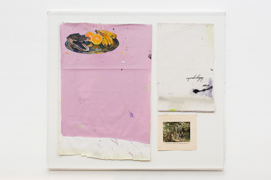 acrílica, esmalte sintético sobre tela, caneta e impressão