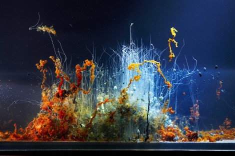 02 Hicham Berrada, Présage, tranche, 2015, Paysages chimiques en évolution ralentie dans cuve en verre, 37 x 28 x 5 cm