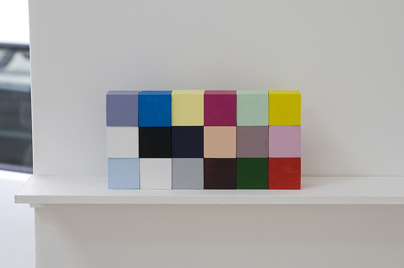 Aurelién Froment, Aurélien Froment Debuilding (Kodak Color Control Patches), 2009, painted wooden cubes of 2,5 cm each. View of the exhibition Moon star love, 2009 – Photo Aurélien Mole