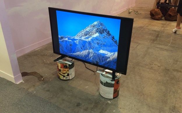 If this sounds a little mundane and predictable, it’s because it is. However, that does not mean the fair isn’t worth attending, not by a long shot. What Material has is excellent work from known figures and fresh examples of new artists and galleries. On the ground floor Sultana was showing a set of Celia Hempton paintings, the anonymous chat- roulette genitalia ones; City Limits displayed a selection of sculpturally arranged digital fabric prints by Nando Alvarez-Perez, and (un cuarto) has a wall painted green with work by Leo Marz and Marco Treviño. Upstairs there was a striking video installation by Rehang Zaman with Syndicate; Michael Jon & Alan gallery from Miami were showing a digital gallery by Siebren Versteeg; and Project Pangée went all out with their painting installation. The only downside, Chez Mohamed gallery had run out of their t-shirts.