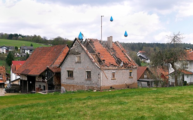At the opposite end of the show this threat is realised in Tränen (2015), a video presentation of a rural German cottage being crushed down to the foundations by a series of giant raindrops. Three at a time they slowly descend onto the roof tiles, timber work and the breeze block exterior. One plummets straight through the roof, another deflect off, tearing a route through the tiles, the third clips the apex falling behind the building. Slowly, over nine minutes, the impacts have a collective result, through the roof, through the timbers, taking down the walls and pummelling the remains.
