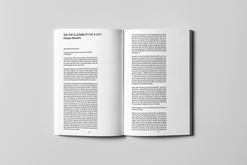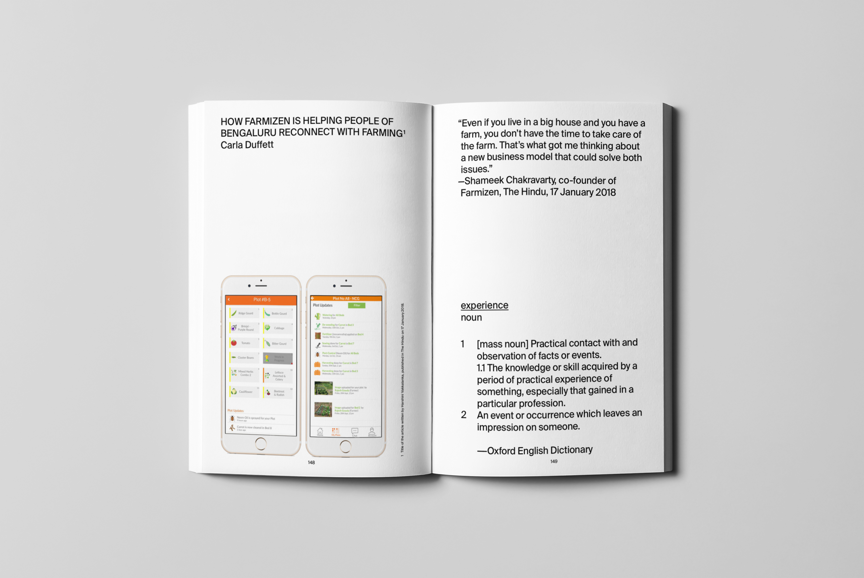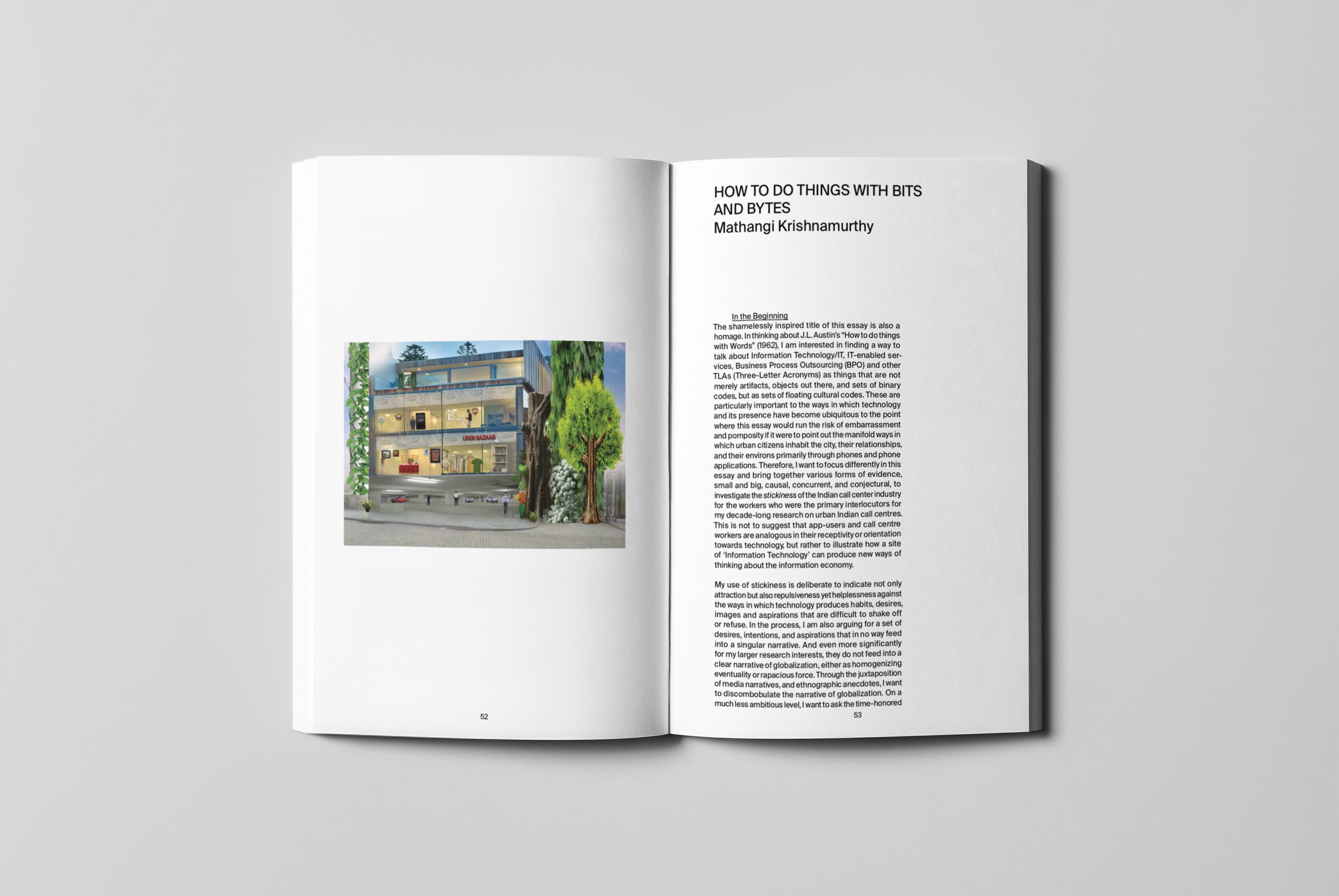 Marialaura: Silicon Plateau is literally a topographical reference – it’s the nickname of Bangalore, which lies on the Karnataka Plateau in the south-eastern part of the Indian state of Karnakata. We appropriated this descriptive name as a title to point at how the identity of the city (as many other cities in the world) has been shaped by the ecosystem created by the IT industry. We are interested in critically exploring this by moving beyond simplistic stereotypes and ideas about technological progress, which is too often understood as a generalised, global phenomenon whose effects are abstracted. If I say Silicon Plateau rather than Bangalore, your approach to reading its urban environment will most likely be affected by cliched visual ideas and narratives that are not situated in any specific local ecosystem and its nuances. Silicon Plateau wants to challenge this by focusing on the specificities of a place and individual human experiences. Beyond the grey, clean geometrical patterns of the book cover (a signature style of tech buildings that dot the city, or any Silicon city for that matter), the reader finds stories that provide a behind the scene to global technological narratives, such as the life of a young woman working in a customer support department of a tech company, the daily exchanges between on-demand drivers and their clients and the stories arising from their conversations, the expectations of the customers of the new economy when they outsource farming through rental services, and so on.
