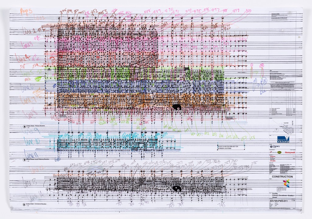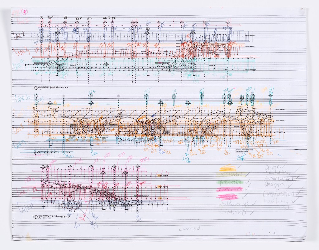 MS: It’s complex. When I begin working on a new project, I never know what the final result will be. I start from a strong feeling of a place – it can also be an argument around it – which eventually evolves into a thought process. My work is very spontaneous so the outcome is different all the times. At the moment, I am developing the drawings to the best of my ability through a music program, translating dots, squiggles and lines, forms and structures into a rhythmic score that is harmonised. A shape in the space, which might correspond to a line in the architects’ drawings of a building, can become a series of dots and marks that will shape the musical composition. I am currently up to the part where I interpret some character into the pace of the music, loud and soft tones, thinking about the spatial aesthetics of the place and its purpose, trying to express all of this in sound.